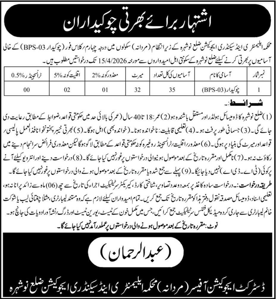 The Elementary & Secondary Education Department Nowshera has announced new government job opportunities for the post of Chowkidar (BPS-03). This recruitment drive aims to fill vacant positions in public schools across the district, providing stable employment opportunities for local residents.