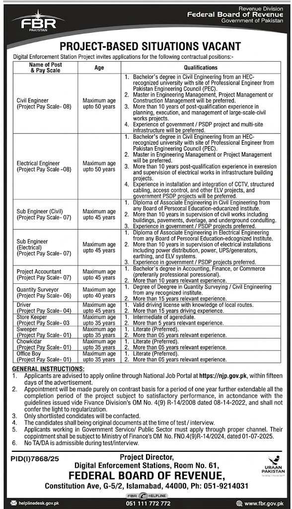 - The Federal Board of Revenue (FBR) has announced various positions under the Digital Enforcement Station Project, including roles such as Civil Engineer, Electrical Engineer, Sub Engineer (Civil), Project Accountant, Driver, Store Keeper, Sweeper, and more.