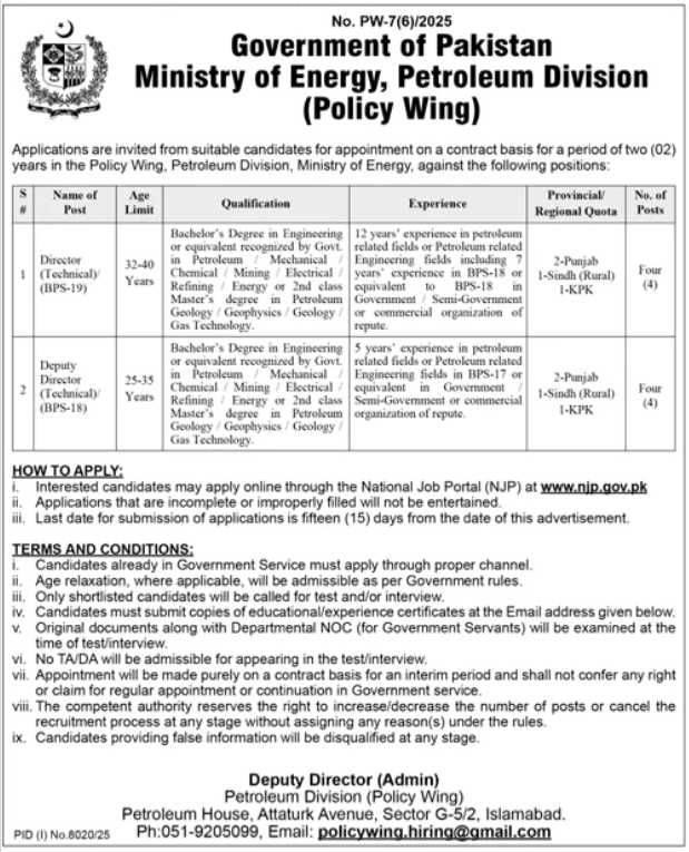 The Ministry of Energy, Petroleum Division (Policy Wing), Government of Pakistan is inviting applications for appointment on a contract basis for a period of two (02) years for the following positions: