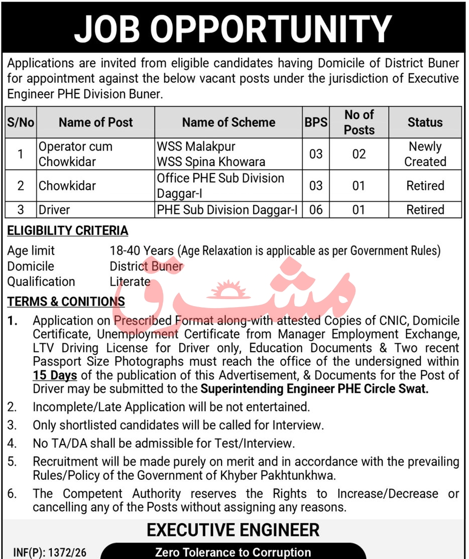 Applications for Operator and Chowkidar posts must be submitted within 15 days of the advertisement, while Driver applications can be sent to the Superintending Engineer PHE Circle Swat.