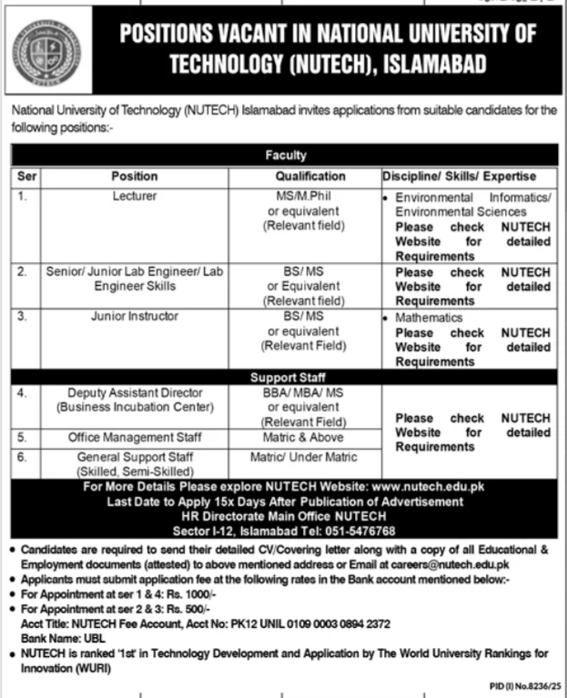 • Address: HR Directorate, Main Office, NUTECH, Sector I-12, Islamabad