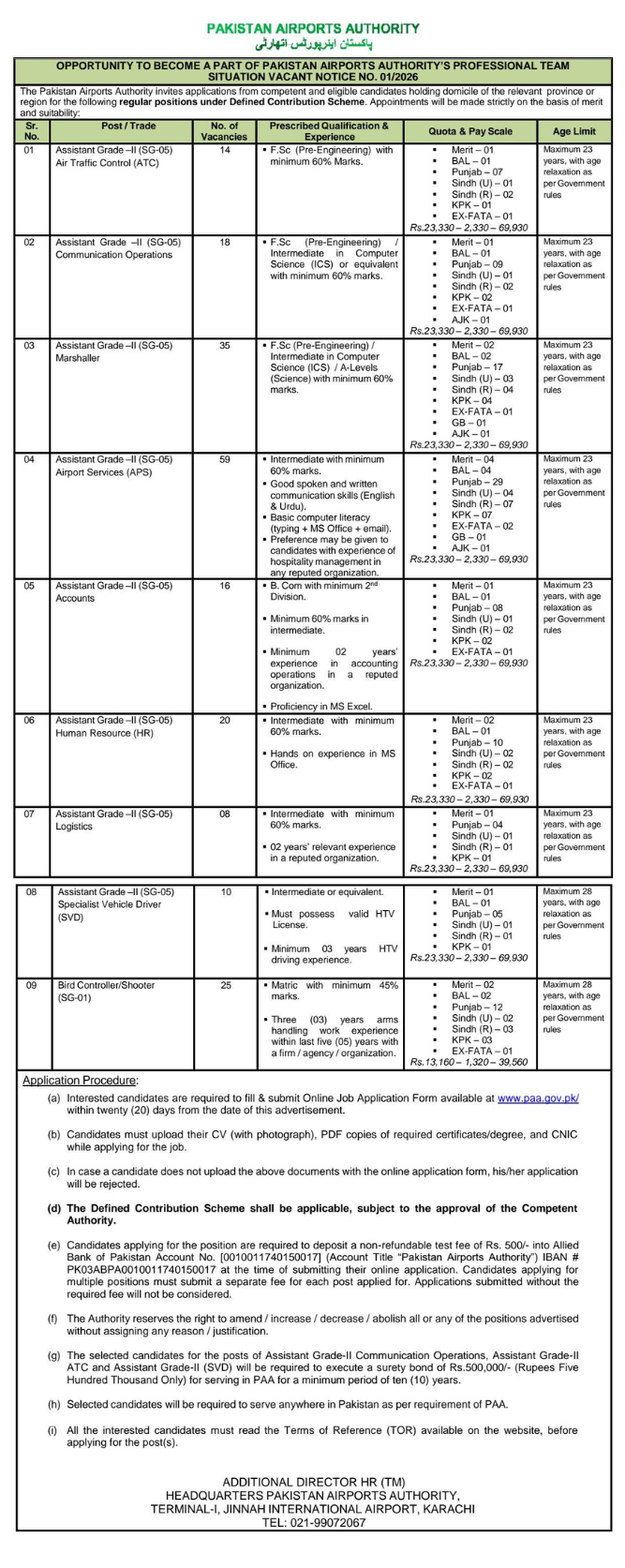 The Pakistan Airports Authority (PAA) has announced multiple government job opportunities through Situation Vacant Notice No. 01/2026. These vacancies provide excellent career opportunities for candidates across Pakistan who meet the required educational qualifications and eligibility criteria. Positions are available in several departments including Air Traffic Control, Communication Operations, Airport Services, Human Resources, Logistics, Accounts, and more.