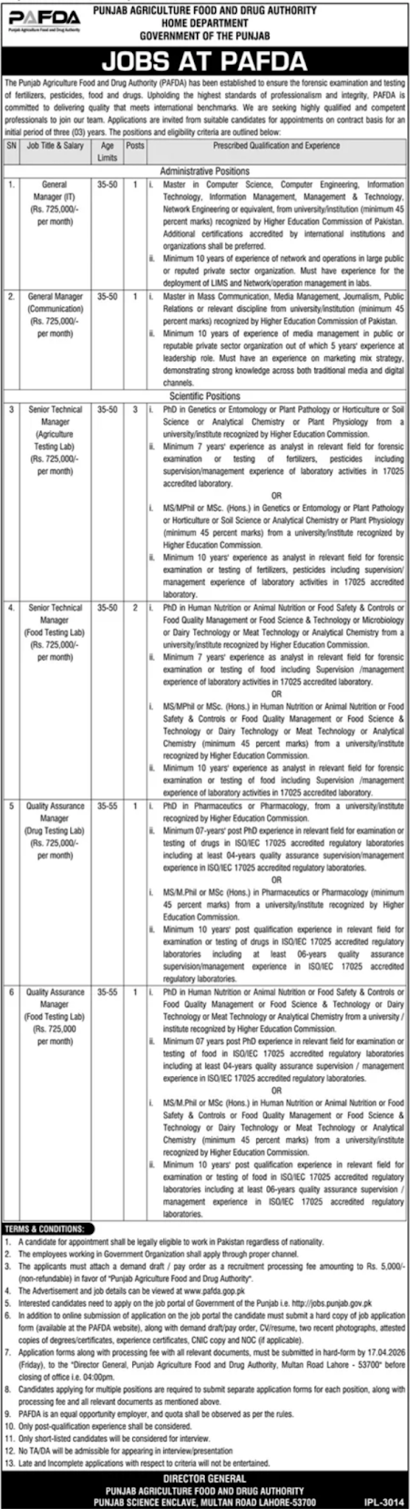 The Punjab Agriculture Food and Drug Authority, working under the Home Department of the Government of the Punjab, has announced high-level job opportunities for qualified professionals. These positions are offered on a contract basis for an initial period of three years. PAFDA aims to strengthen forensic testing of fertilizers, pesticides, food, and drugs while maintaining international standards.