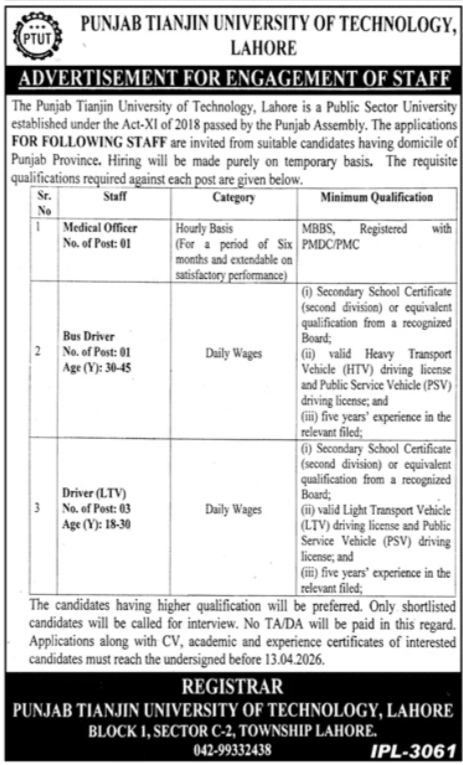Applicants must submit their CVs along with academic and experience certificates to the Registrar, Punjab Tianjin University of Technology, Lahore before 13th April 2026.