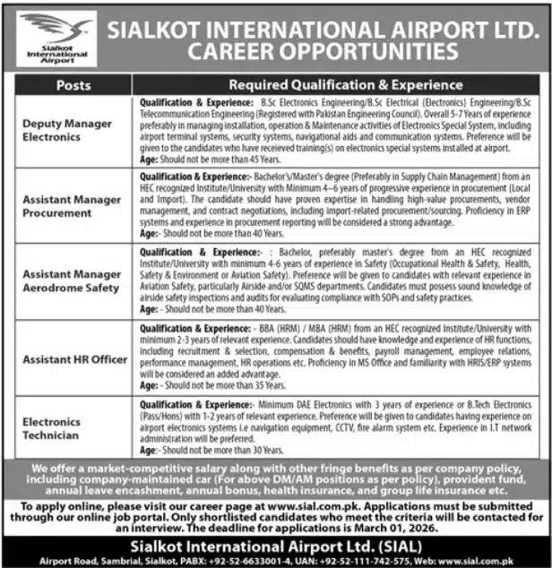 Sialkot International Airport Jobs 2026 announces multiple career opportunities for skilled and qualified professionals in the aviation sector. Sialkot International Airport Ltd. is hiring for key positions including Deputy Manager Electronics, Assistant Manager Procurement, Assistant Manager Aerodrome Safety, Assistant HR Officer, and Electronics Technician. These vacancies are ideal for candidates with relevant engineering, management, HR, and technical backgrounds. The organization offers a professional work environment focused on operational excellence and safety standards.
