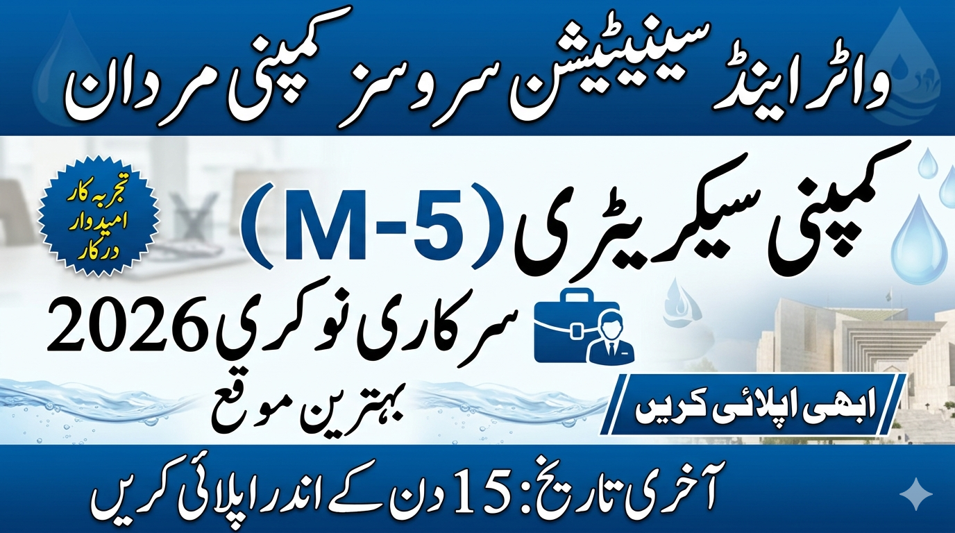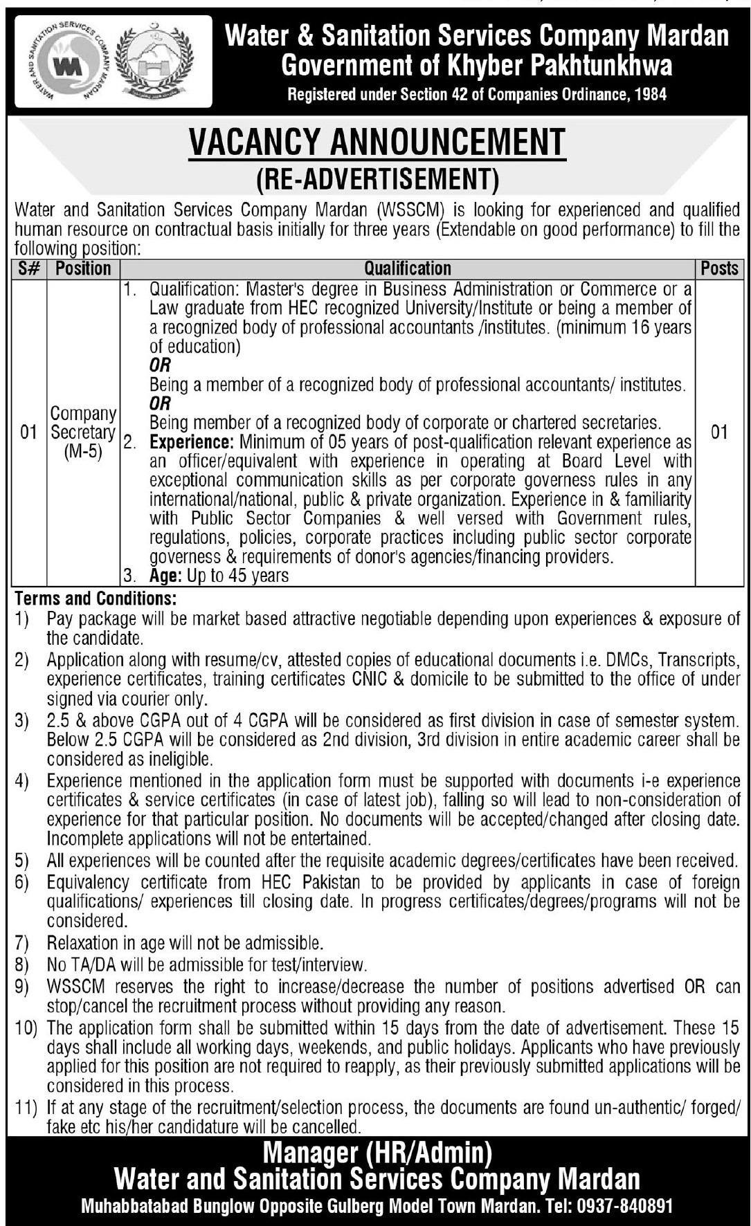 Water and Sanitation Services Company Mardan (WSSCM), working under the Government of Khyber Pakhtunkhwa, has announced a vacancy (re-advertisement) for qualified and experienced professionals. The organization is seeking applications for the position of Company Secretary (M-5) on a contractual basis for three years, extendable based on performance.